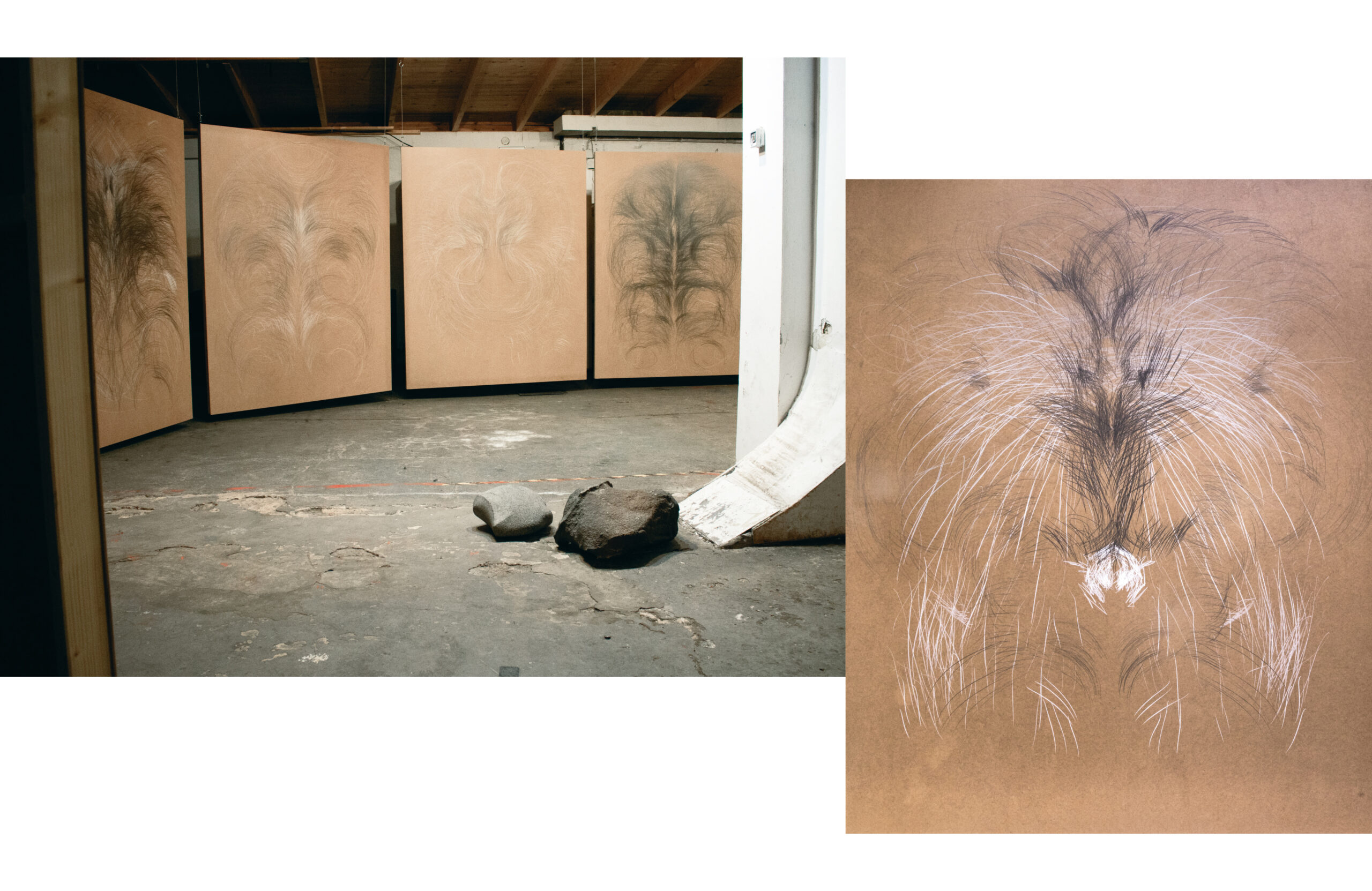 Graphit und Farbstift auf Holz, 170 x 210 cm, Stein | Installationsansicht Schaumburg Bonn | 2019